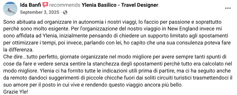 Sono specializzata in itinerari personalizzati negli Stati Uniti, con un focus particolare sul New England, la regione che chiamo casa da oltre 10 anni.